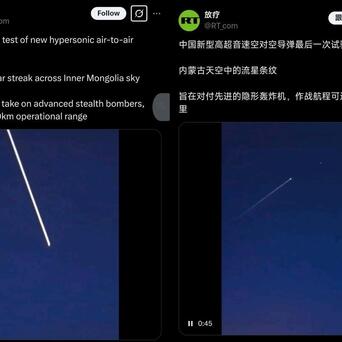 近日,“今日俄罗斯(RT)”曝光了一段视频称,中国已经成功试射了最新型高超音速空空导弹,该导弹最高飞行速度高达10马赫,射程则高达1000公里。俄媒称,这两个数据都是“划时代”的,因为目前全球最先进的空空导弹(中国的霹雳-17、俄罗斯的R-37M)射程大约300多公里,速度则只有5-6马赫。显然,中国的新型空空导弹比现有导弹要先进上一个量级。
